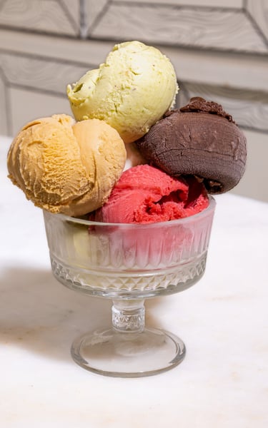 Tatlı deneyimini en üst noktaya taşımak adına suflelerimizi, yalnızca bizde bulabileceğiniz, tamamen kendi imalathanemizde üretilen özel dondurmamızla tamamlıyoruz. Bu dondurma, suflemizin yoğun kıvamını dengeleyerek damakta eşsiz bir uyum yaratıyor.